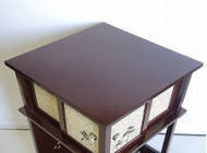 徒然棚とは菱形の三本柱の二重棚で、天板の下が袋棚になっており、菱形の透かし模様が入っているのが特徴です。