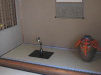 大炉とは、茶室に切る炉のひとつで、正式な寸法の一尺四寸四方より大きい一尺八寸四方の炉をいいます。 大炉は、裏千家で玄々斎が嘉永二年の知恩院門跡尊超法親王の献茶の折に創案されたもので、六畳逆勝手を本法とする裏千家独自のものです。裏千家では、二月の厳寒の時期にのみ開かれます。